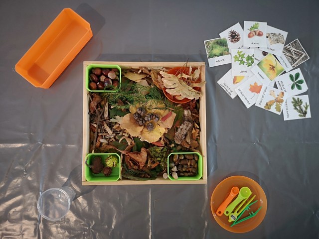 Quoi de mieux en ce premier jour d’automne qu’un bac sensoriel avec les trésors de la forêt, collectés lors de balades.