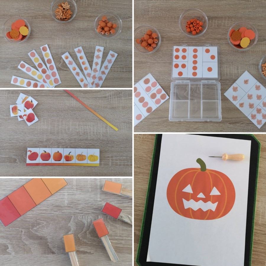 Fiches d’activités autour de la couleur orange : motricité fine (laçage et poinçonnage), discrimination visuelle (nuancier orange, nuancier citrouille), mathématiques (dénombrement et algorithme). Voir les activités en pratique.