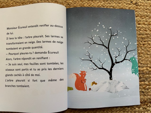 C’est alors qu’un écureuil de passage eut l’idée de faire un bonhomme de neige pour réchauffer le cœur de l’arbre qui pleurait. Ses larmes se transformèrent alors en flocons de neige.