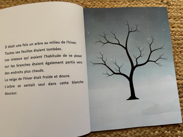 Il raconte l’histoire d’un arbre qui se sent seul quand l’hiver emporte toutes ses feuilles et les oiseaux qui avaient l’habitude de s’y percher. Outre la neige blanche et douce, l’hiver a aussi laissé sur son passage quelques objets : bonnet, écharpe, carotte, pommes de pin, balai, glands.