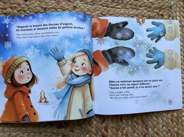 Celle-ci lui fait découvrir les plaisirs de l’hiver, des petits bonheurs simples comme faire des nuages de buée avec sa bouche, contempler les flocons, chercher les traces des animaux, jouer aux anges de neige…