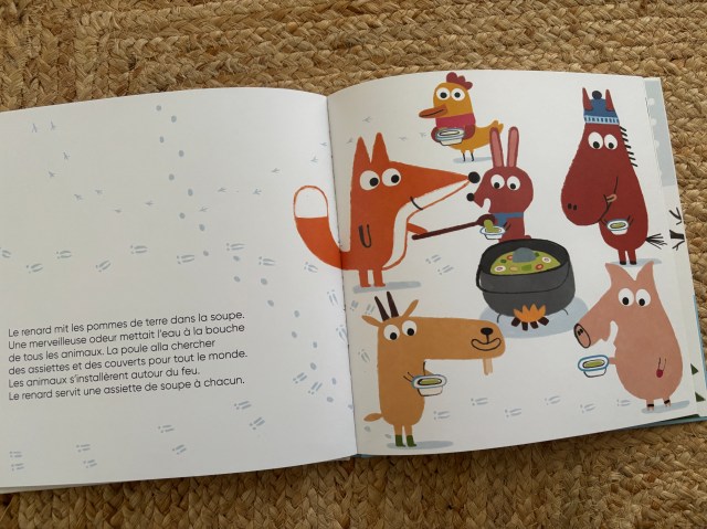 Dans le froid de l’hiver, un renard s’installe sur la place d’un village. Il sort de son sac une marmite et y dépose un gros caillou pour faire une soupe qu’il dit délicieuse. Intrigués, les habitants le rejoignent et se laissent convaincre par le renard d’apporter de nouveaux ingrédients à la recette.