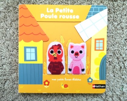 Il s’agit d’une collection de livres marionnettes que j’aime beaucoup. Ces livres cartonnés ont un tout petit format qui permet à Naïa de les manipuler assez facilement. Ils mettent en scène des animaux (en l’occurrence une poule) matérialisés par une marionnette à doigt que l’on va pouvoir animer au fil de l’histoire.