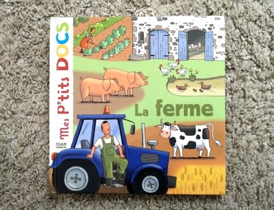 Un livre (acheté en brocante) destiné aux 4-8 ans. Ce livre documentaire interactif permet de découvrir tous les secrets de la ferme. Les volets à soulever, les tirettes à actionner rendent la lecture plus ludique. On y découvre les bâtiments de la ferme, la traite des vaches, la vie de cochon, la visite du poulailler, d’autres animaux de la ferme, des tracteurs à tout faire, les champs, les fruits et légumes… Un livre très complet.