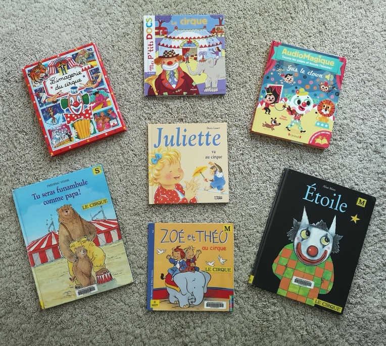 Pour notre nouvelle thématique sur le cirque, j’ai constitué une petite sélection de livres. Nous avions déjà 4 livres sur le sujet : 2 livres documentaires et 2 histoires. J’ai complété par 3 livres d’histoires que j’ai emprunté à la bibliothèque.