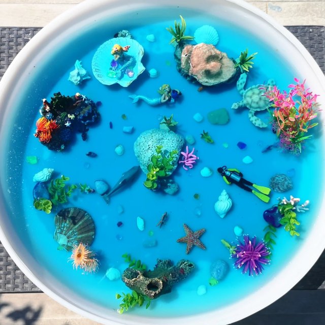 Notre étagère d’activités a pris des allures d’océan et de plage (elle faisait office de table de saison/thématique).