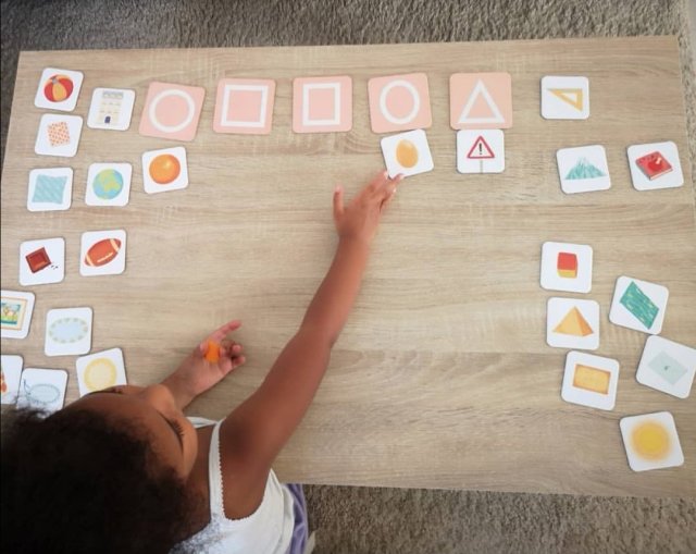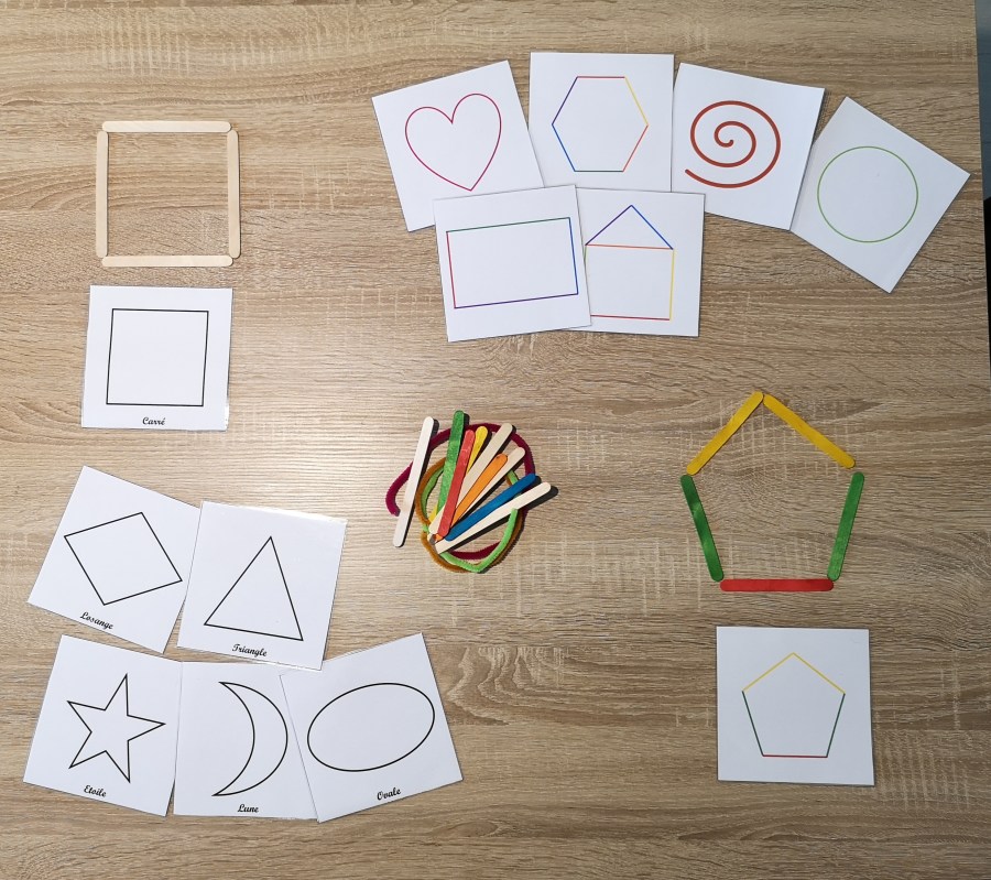 Je les ai acheté pour apprendre le nom des formes géométriques à Mila, avec une activité de mise en paire avec ces cartes de nomenclatures.