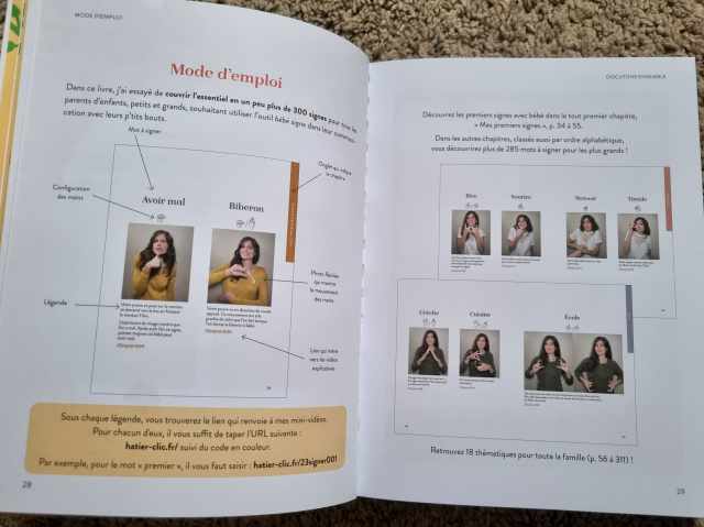 Il y a également une première partie théorique sur les bienfaits de l’utilisation des signes avec son bébé et du maternage proximal plus généralement ainsi que des conseils pratique pour mettre en place cette pratique (quand commencer, comment procéder, combien de signes à mettre en place, quels premiers signes…).
