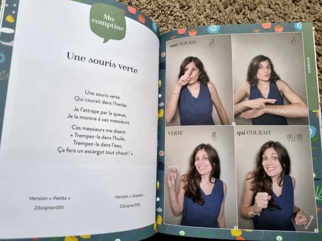 J’aime le fait qu’il y a plusieurs comptines signées (Une souris verte, Petit escargot, J’aime la galette…). C’est une façon ludique d’apprendre les signes et généralement les enfants sont très friands des comptines accompagnées de gestes. On va d’ailleurs essayer de les apprendre avec les enfants.