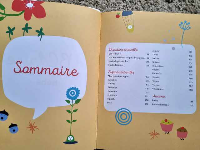 Dans cet ouvrage, vous trouverez + de 300 signes organisés par thématiques (activités, animaux, émotions, famille, jouets, lieux, nourriture…) puis par ordre alphabétique. Ce qui est très pratique pour trouver rapidement un signe. La présentation est épurée, ce qui est appréciable.