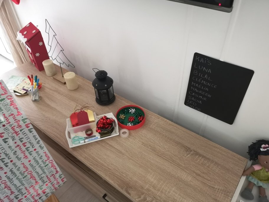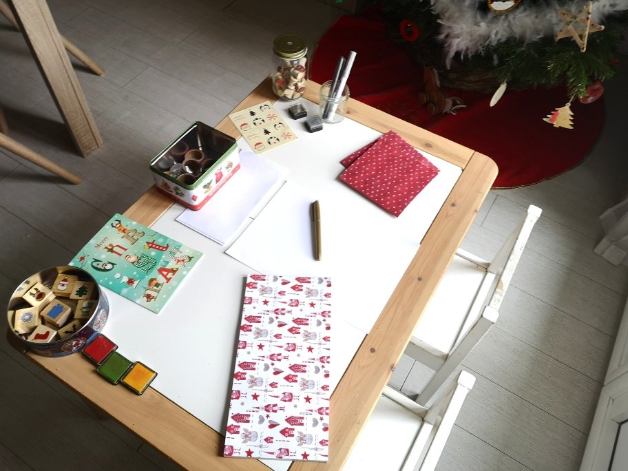J’ai installé une table, sur laquelle se trouvait notre boite aux lettres de l’Avent, des feuilles blanches, des feuilles à motifs de Noël, des tampons de Noël, des gommettes, des rouleaux de masking tape, des feutres argent et doré (tout vient d’Action, à l’exception des gommettes qui viennent de Carrefour).