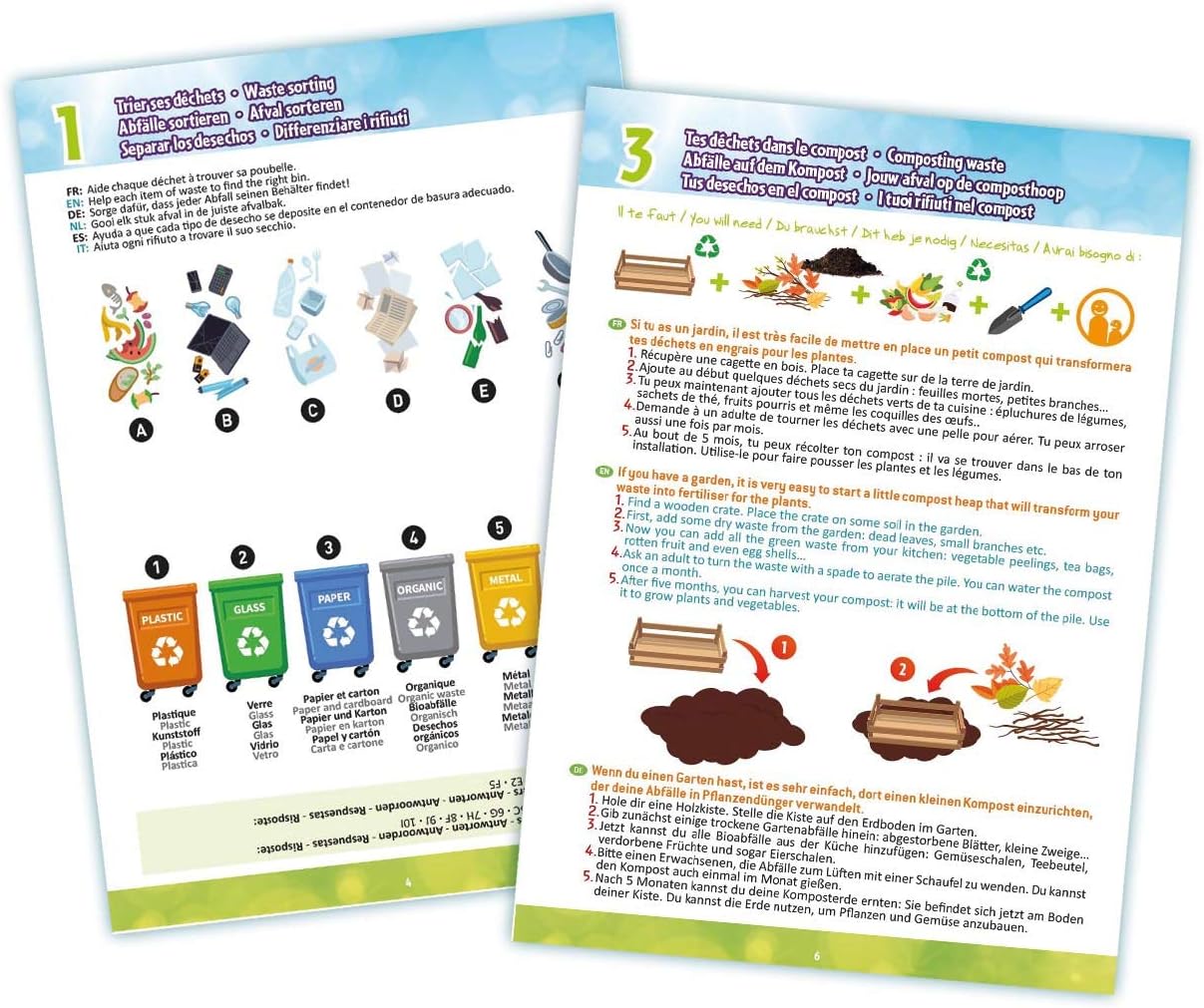 Le kit inclut une notice avec deux petits exercices permettant de mieux comprendre comment trier ses déchets et d’en apprendre plus sur la décomposition naturelle des déchets. Il y a également trois idées d’activités à faire avec des déchets : du compost et deux objets recyclés.