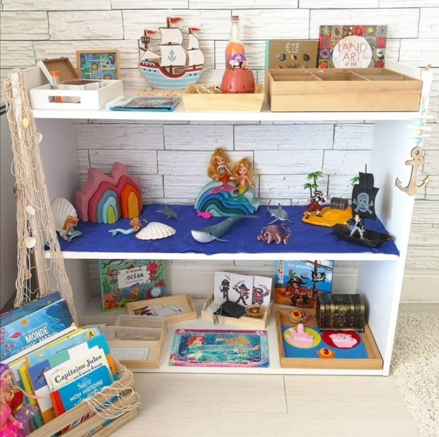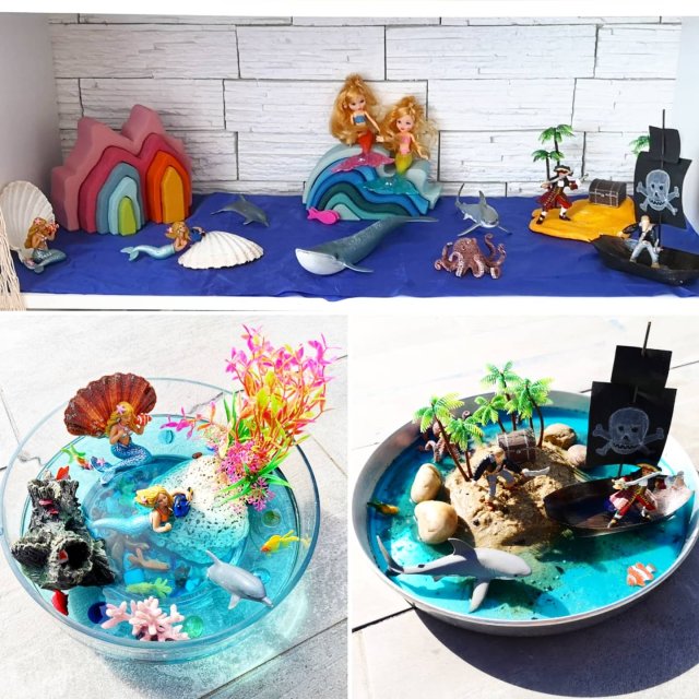 Notre thème des pirates et des sirènes est désormais terminé. Il nous aura occupé une semaine. Les enfants ont beaucoup apprécié ces deux univers qui se prêtaient bien aux jeux d’imagination (avec figurines et déguisements) qu’ils apprécient tout particulièrement.