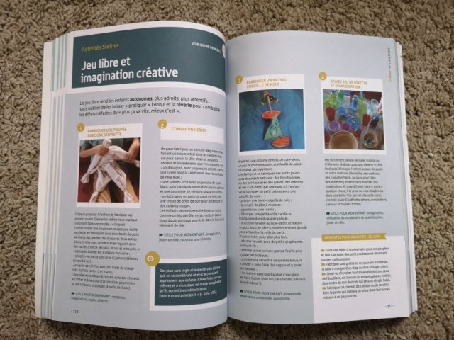 27 pages sont dédiées à la pédagogie Steiner-Waldorf et permettent d’avoir une vision synthétique mais complète de cette pédagogie. Les grands principes y sont et sont bien synthétisés. J’aime bien aussi la partie matériel. Ce manuel présente quelques activités dans différents domaines.