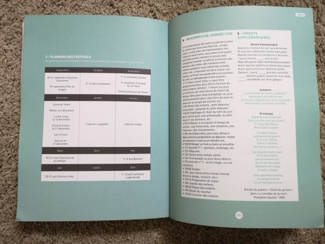 Il se termine par plusieurs annexes qui aident à mettre en place concrètement la pédagogie à la maison : plannings des festivals, exemples de planning hebdomadaire, de journée type, de correspondances journalières pour le rythme hebdomadaire, aquarelle….