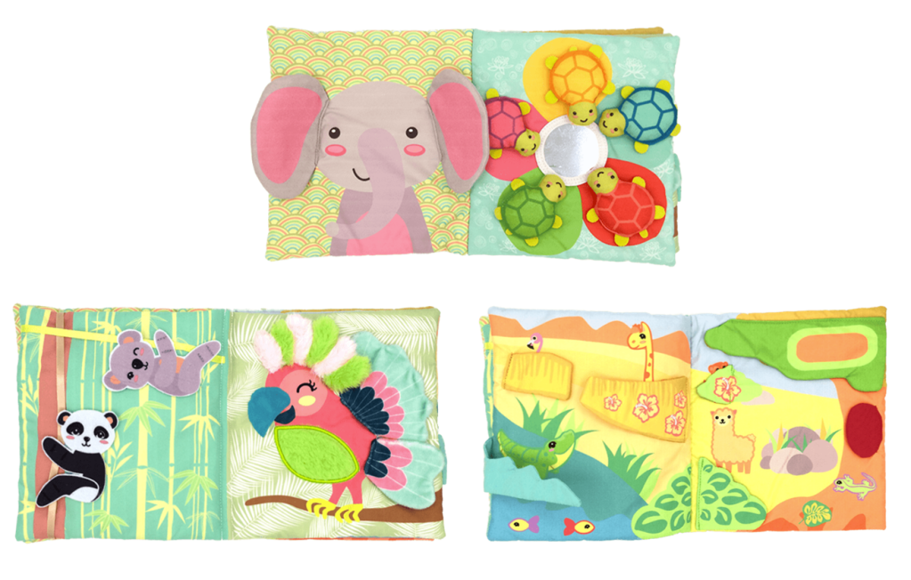 Ce livre propose 5 jeux d’éveil : un éléphant avec des oreilles à froisser, une fleur miroir avec des tortues à scratcher (en fonction des couleurs pour les plus grands), un panda et un koala à faire glisser le long d’une ficelle, un perroquet avec des ailes à froisser et des plumes douces, un décor de coucou caché avec des flaps froissables à soulever.