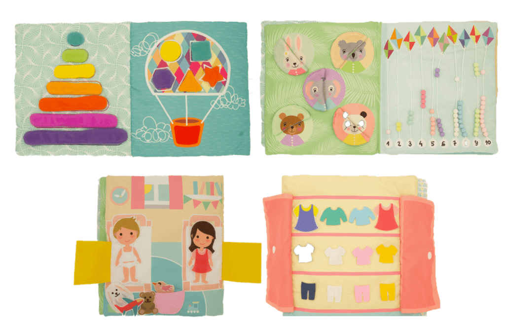 J’aime beaucoup le concept de quietbooks. Il s’agit de livres d’éveil en tissu, dans lesquels sont proposés différentes activités ludiques et éducatives, adaptées en fonction de l’âge de l’enfant. Les activités sont conçues de sorte à éveiller la curiosité des enfants et à pouvoir être faites de façon autonome. Au-delà de stimuler les sens et développer différentes compétences psychomotrices, ces livres permettent divers apprentissages et favorisent également le calme et la concentration.