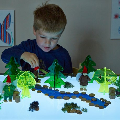 J’ai pris des produits (plateforme, maisons, arbres) pour créer des minis-mondes lumineux. Mais les enfants peuvent aussi jouer avec sans table lumineuse.
