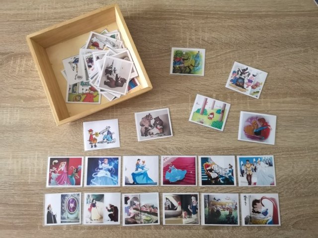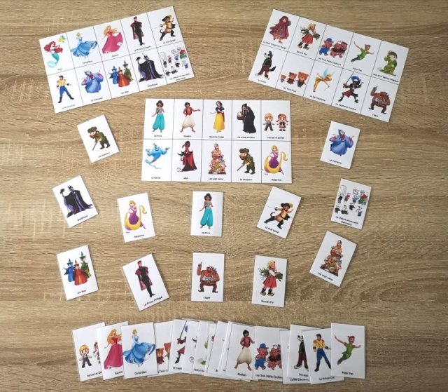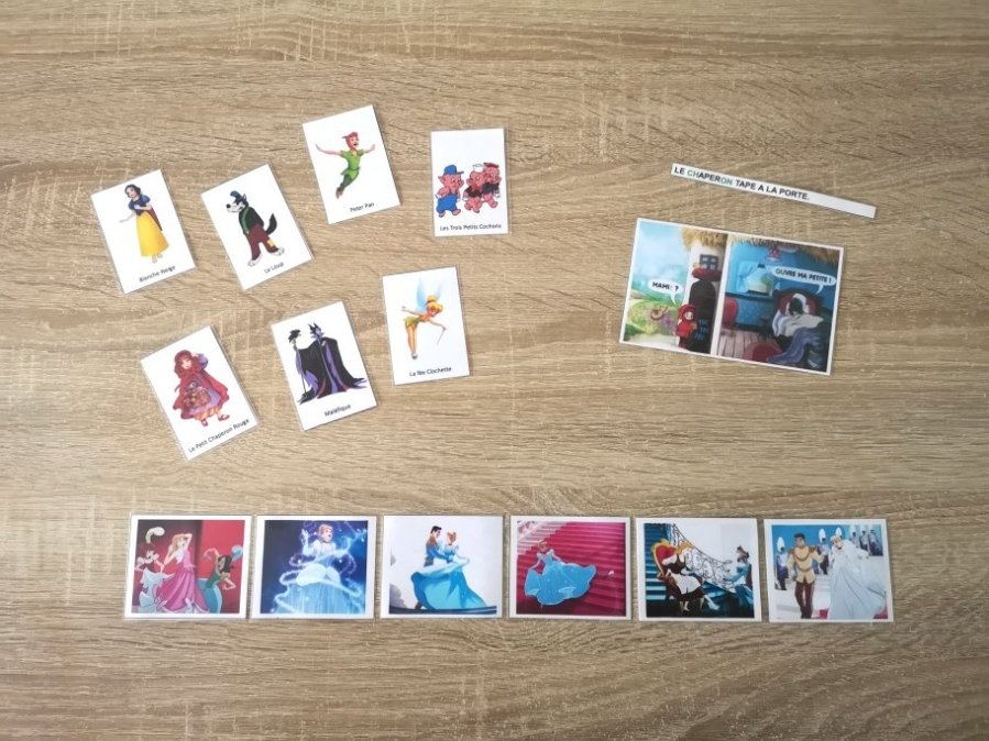 Il y a les contes suivants : La belle au bois dormant, Cendrillon, Blanche-Neige et les sept nains, Boucle d’or et les trois ours, Les trois petits cochons et Le petit chaperon rouge (version classique et revisité de Geoffroy de Pennart). Je trouvais intéressant de comparer la structure de l’histoire du conte classique et revisité, c’est plus simple avec les cartes séquentielles.