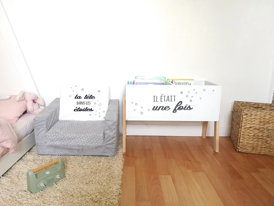 J’ai enlevé l’ancienne petite bibliothèque que je ne trouvais pas pratique car les compartiments étaient trop étroits et les séparateurs trop hauts. A la place, j’ai pris ce bac à livres (Mano Mano). Il permet de mettre pas mal de livres et de les ranger de face, ce qui permet à l’enfant de chercher facilement parmi les livres. J’adore le design avec l’inscription Il état une fois.