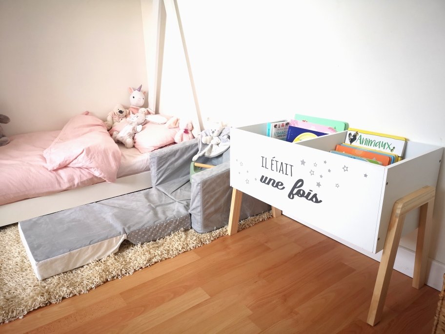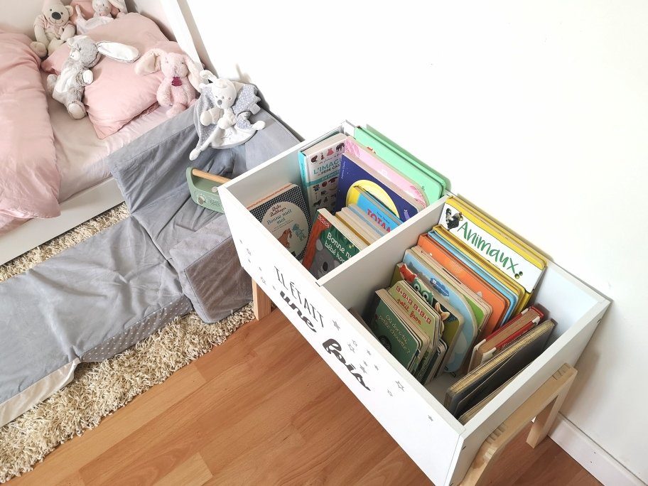 Je l’ai mis à côté du lit, car cela permet d’avoir les livres à portée de main, si l’on veut lire des histoires dans le lit, notamment au moment du coucher.