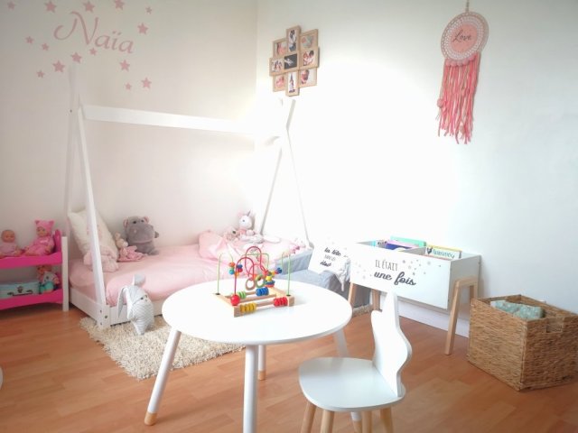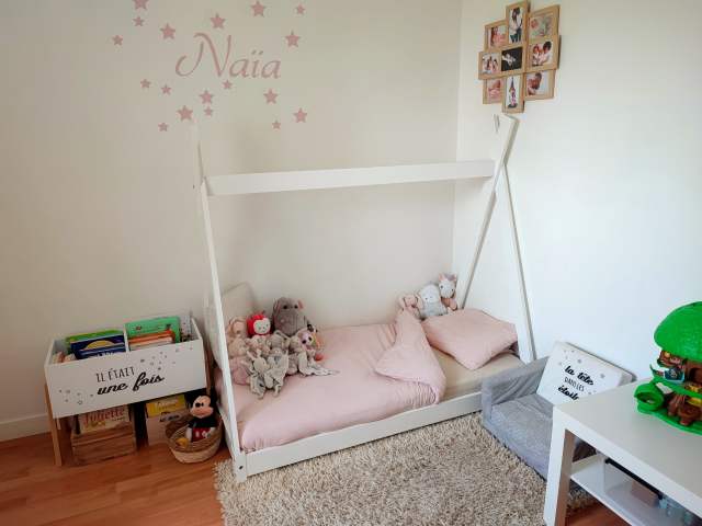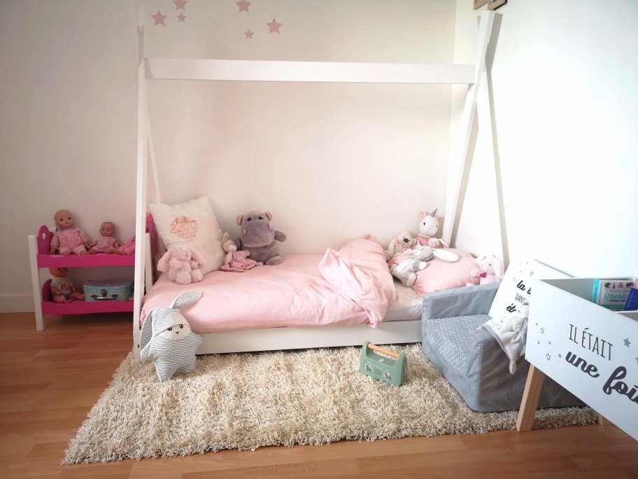 La chambre de Naïa n’est vraiment pas grande, je ne voulais donc pas un lit de 140 cm de long. Et je ne voulais pas qu’il soit trop haut en hauteur. C’est pourquoi j’ai préféré partir sur un lit tipi plutôt qu’un lit cabane. J’ai hésité avec un lit avec tiroir pour avoir du rangement mais j’aurai été moins rassuré avec la hauteur, d’autant que Naïa bouge beaucoup la nuit. Je préférais donc être plus sereine, je sais que déjà la séparation ne va pas forcément être facile. Peut-être même plus pour moi que pour elle, puisqu’elle est mon dernier bébé, c’est donc la fin du partage de mon lit !