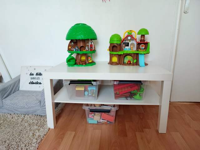 - un espace pour le jeu d’imagination avec la table Flisat Ikea (que j’ai récupéré de la chambre de Mila et Taïs) avec sur le dessus l’arbre et l’école Klorofil et en-dessous des caisses de rangement (Action) pour les accessoires Klorofil, pour la maison forestière Abrick et pour les accessoires de la maison de poupées qu’elle a récupéré de Mila et Taïs.