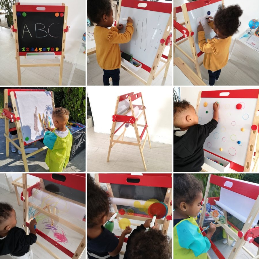 Ce que j’adore c’est sa multifonctionnalité grâce à ses surfaces ardoises et blanches magnétiques, sa surface plexiglass, son rouleau papier pour faire office de chevalet.