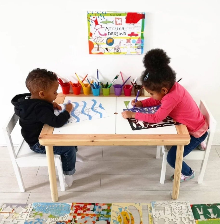 Le fait qu’il y a deux faces est très appréciable quand on a une fratrie. Quand ils sont trois ça devient un peu plus compliqué mais ils peuvent toujours dessiner à deux sur une face (donc convient pour 4 enfants en même temps 😉