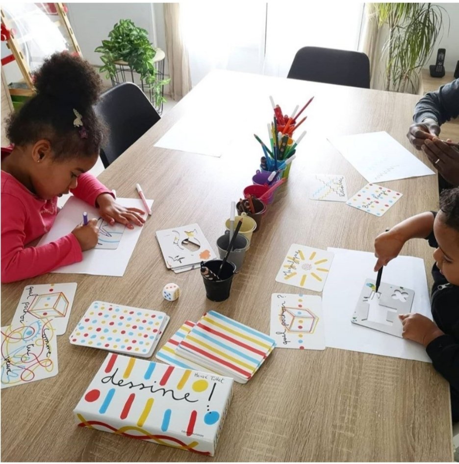 Ici, nous sommes tous très « dessin ». Ces coffrets sont très bien pour travailler le graphisme, stimuler la créativité et partager un temps créatif en fratrie ou en famille. Même un jeune enfant de 2 ans pourra dessiner en coloriant dans les pochoirs, en faisant quelques-unes des consignes (du jeu Dessine !) ou en « gribouillant ».