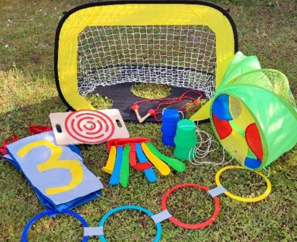 En structure de jeux, nous avons une cage écureuil, un trampoline, des prises et une corde d’escalade (voir mon article L’aménagement d’un espace extérieur). En jeux, nous avons un kit Mon petit club, des jeux plein air Oxybul, des plots (Action), des jeux de bacs à sable, un kit de bulles géantes…