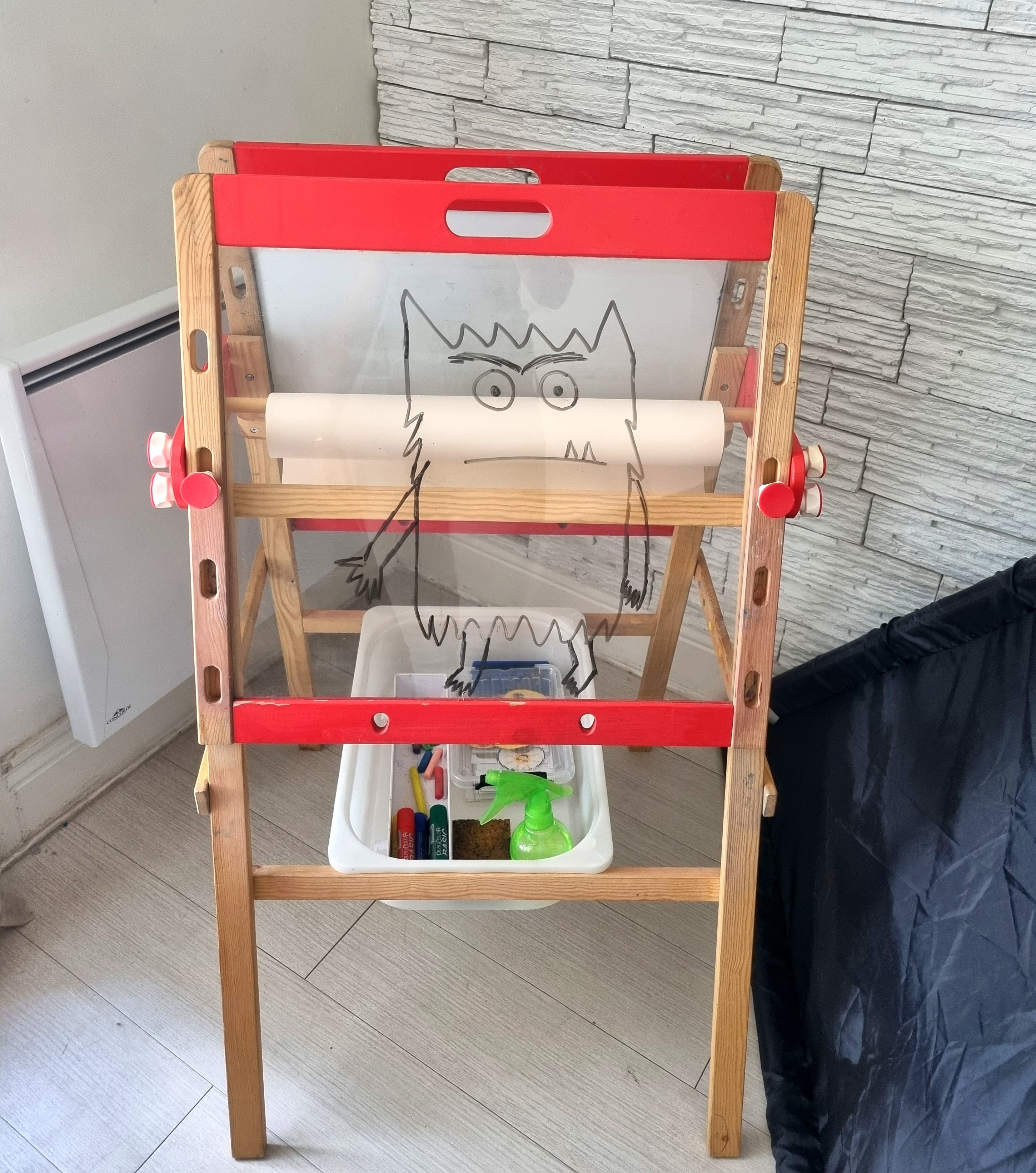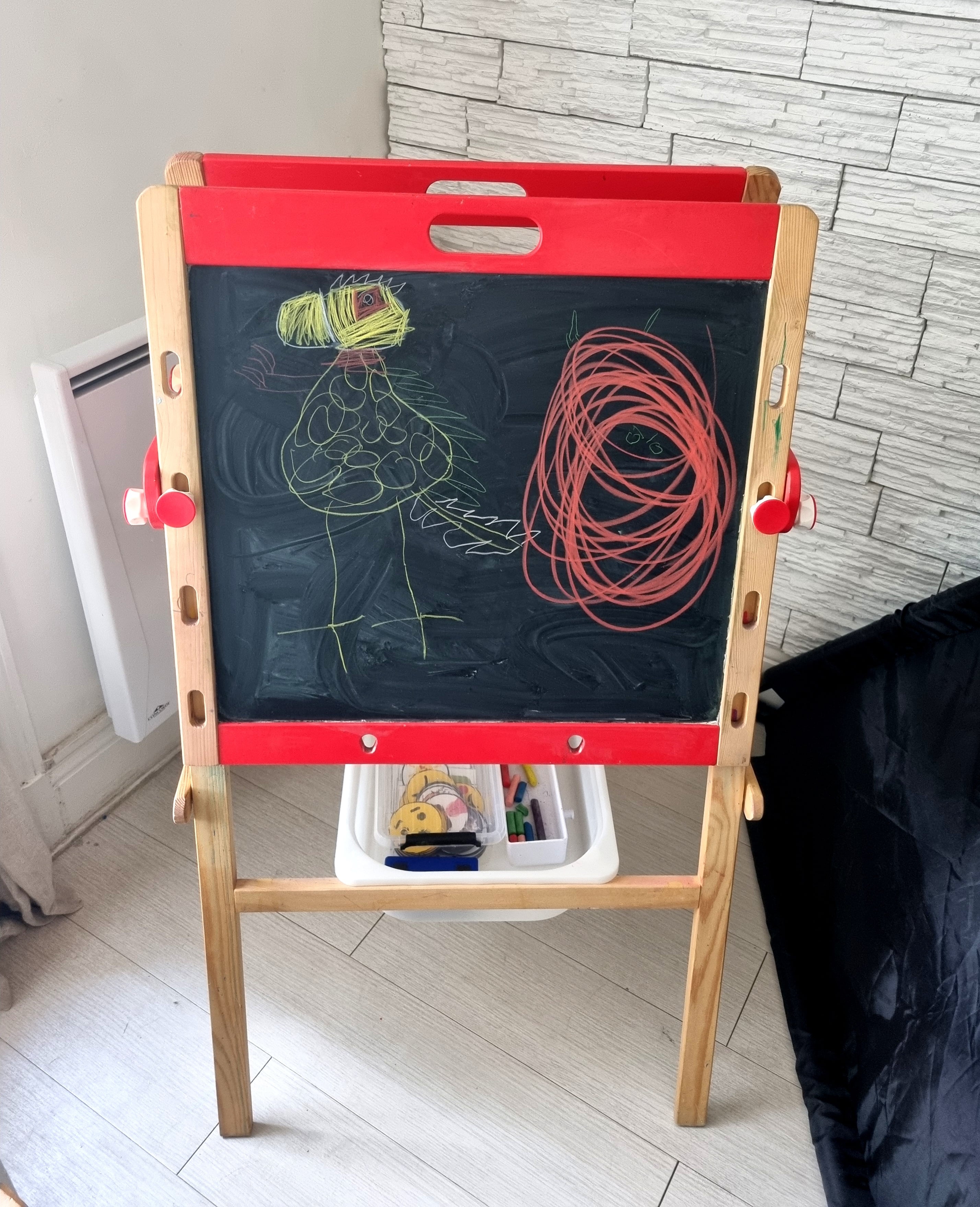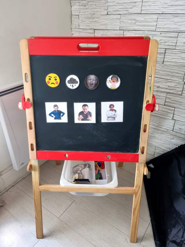 Il était déjà dans le salon mais j’ai décidé de monter aux enfants qu’ils peuvent s’en servir pour gribouiller leur colère, dessiner leurs émotions, il sert aussi de support pour le jeu magnétique des émotions.