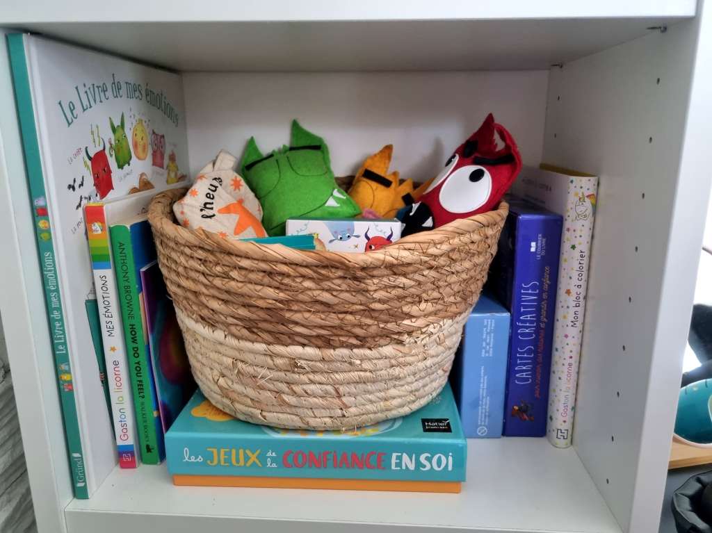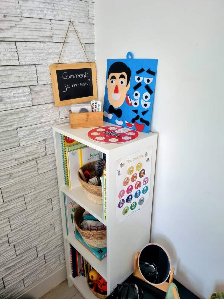 J’aime l’idée d’avoir une étagère pour rendre plus lisible les catégories d’outils à disposition des enfants mais aussi y mettre nos livres sur le sujet. Nous avons pas mal de livres sur les émotions et je trouvais cohérent de les mettre dans cet espace car ils sont eux-mêmes des outils pour accompagner les émotions (voir ma sélection).