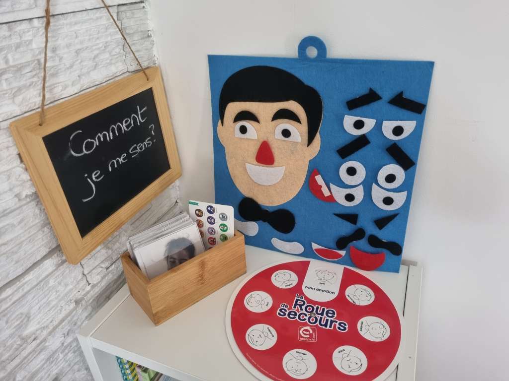 J’y ai mis tous nos petits jeux qui permettent d’identifier, de comprendre les émotions et surtout de les exprimer. C’est notamment des jeux que l’on fait en temps calme.