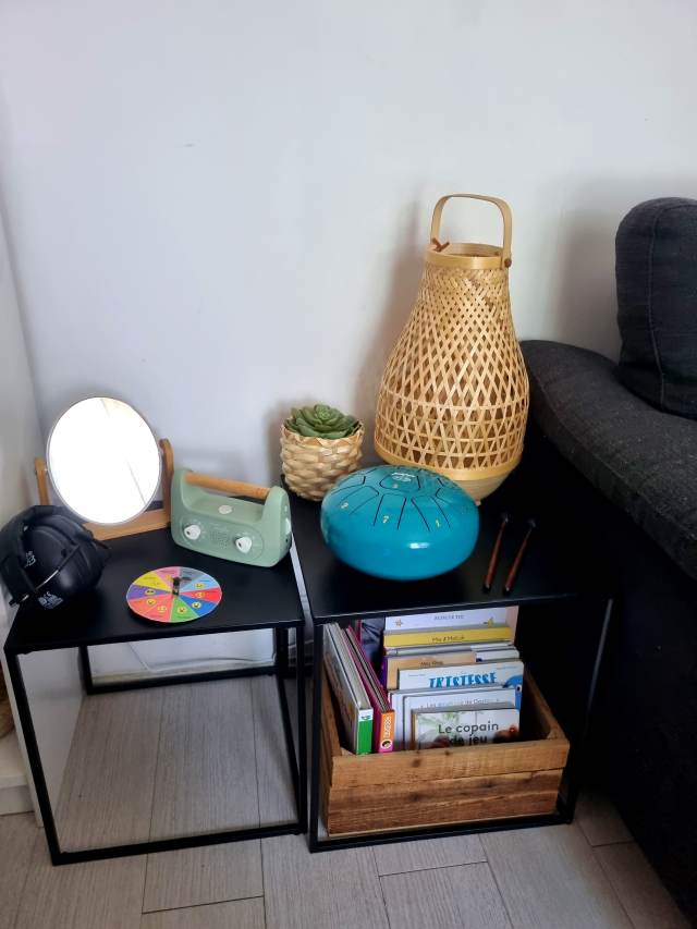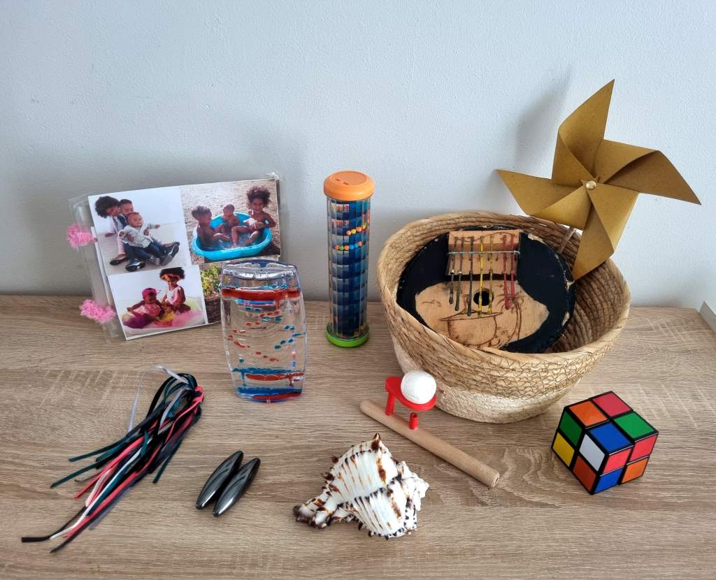 J’y ai mis des objets qui aident à se calmer, à s’apaiser, à détourner l’attention du problème, à retrouver le sourire…