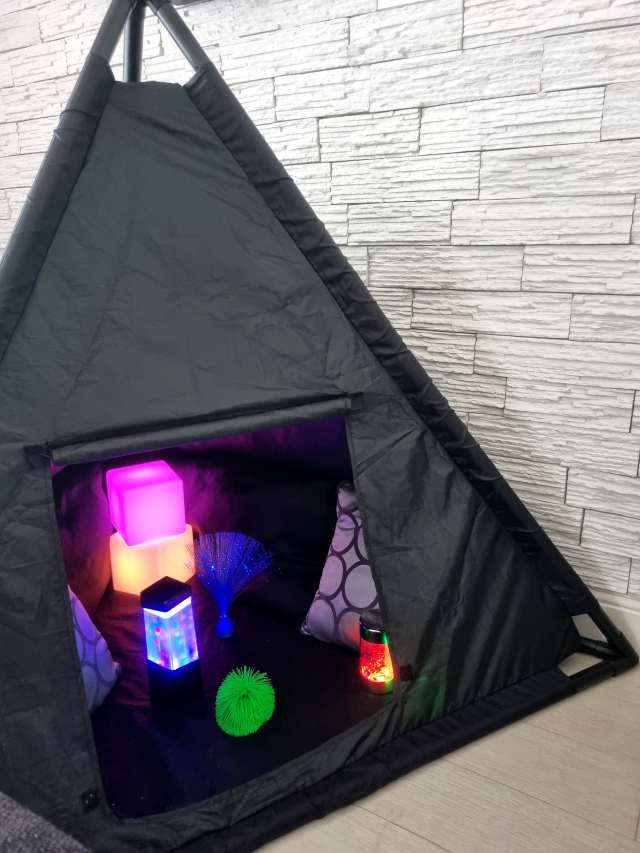 A l’intérieur de la cabane, j’ai mis des coussins, ainsi que des objets lumineux (voir mon article sur les expériences sensorielles et relaxantes pour les références des objets).