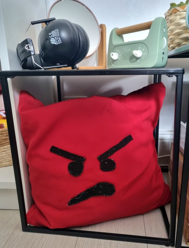 J’ai donc décidé de matérialiser un espace des émotions avec nos outils de retour au calme, de « gestion » de la colère et des émotions plus largement. Cela faisait déjà longtemps que je voulais en installer un mais je ne savais pas trop où. Comme souvent, il a fini dans le salon !