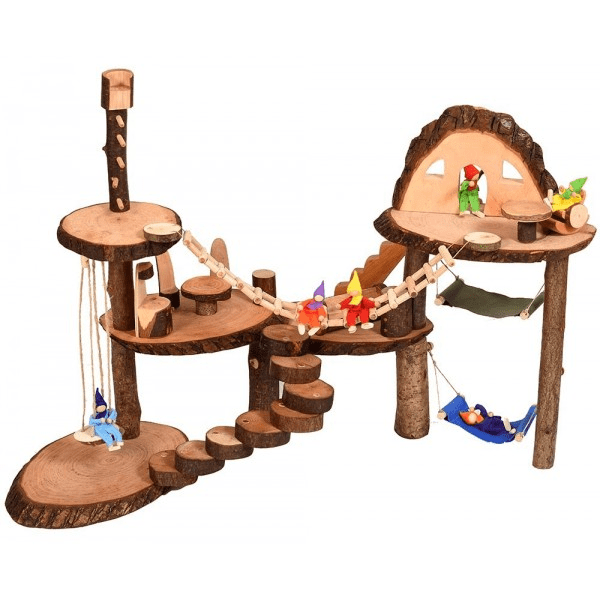 Ce que j’aime beaucoup avec ce type de matériel, c’est qu’il laisse davantage place à l’imagination, à la créativité. Les enfants peuvent moduler les différents éléments pour composer leur propre parc. Le parc peut être une maison, une cabane, un parc de jeux, rien n’est prédéfini. L’échelle, la balançoire, les hamacs, les escaliers apportent vraiment de la jouabilité et stimulent l’imaginaire. De quoi s’inventer pleins d’histoire avec leurs figurines Ambrosius, mais également des personnages (Amazon) et des lutins en bois (Easytis).