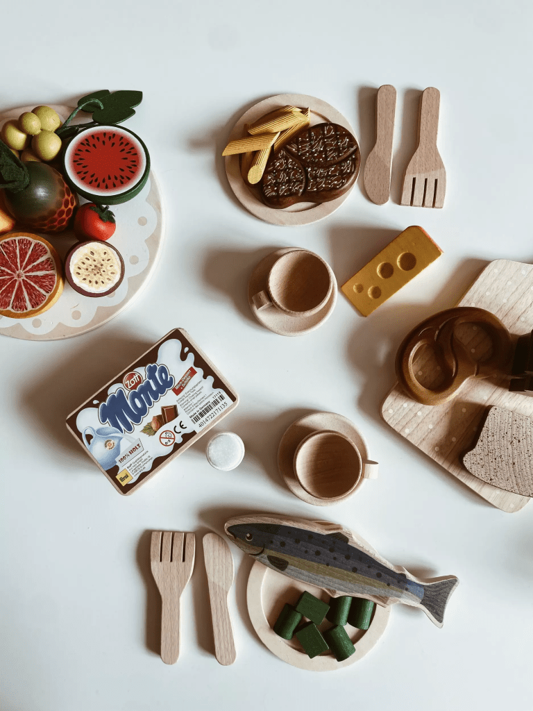 Naïa aime encore beaucoup jouer à la dinette. Mais je trouve que l’on a trop d’aliments notamment en plastique. J’ai donc prévu de faire un grand tri et d’apporter un peu de nouveauté avec ces aliments en bois vraiment bien pensés.