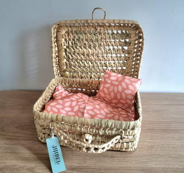Cette valisette en feuilles de palmiers vient du site de décoration Jijibel. J’ai tout de suite pensé à Naïa en la voyant, car elle adore se promener dans toute la maison avec des sacs qu’elle remplit d’affaires. Cette petite valisette (j’ai pris la taille S) sera donc parfaite pour transporter ses affaires. J’ai eu l’idée d’en faire également un petit lit nomade. J’ai cousu un petit matelas et un petit oreiller. Je trouve le rendu adorable ! Je suis sûre que cela plaira beaucoup à Naïa qui pourra notamment l’emmener chez mamie chez qui il n’y a pas de lit de poupée !