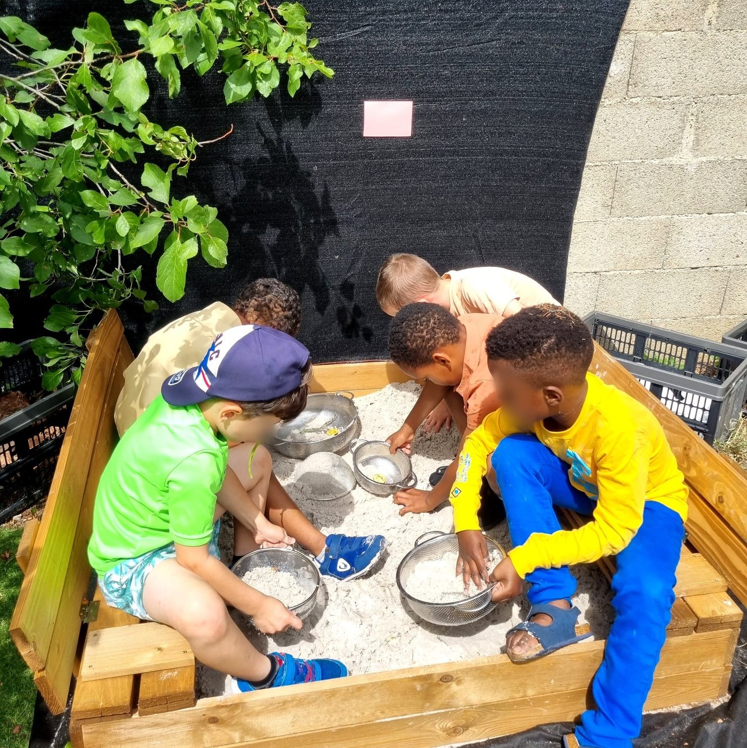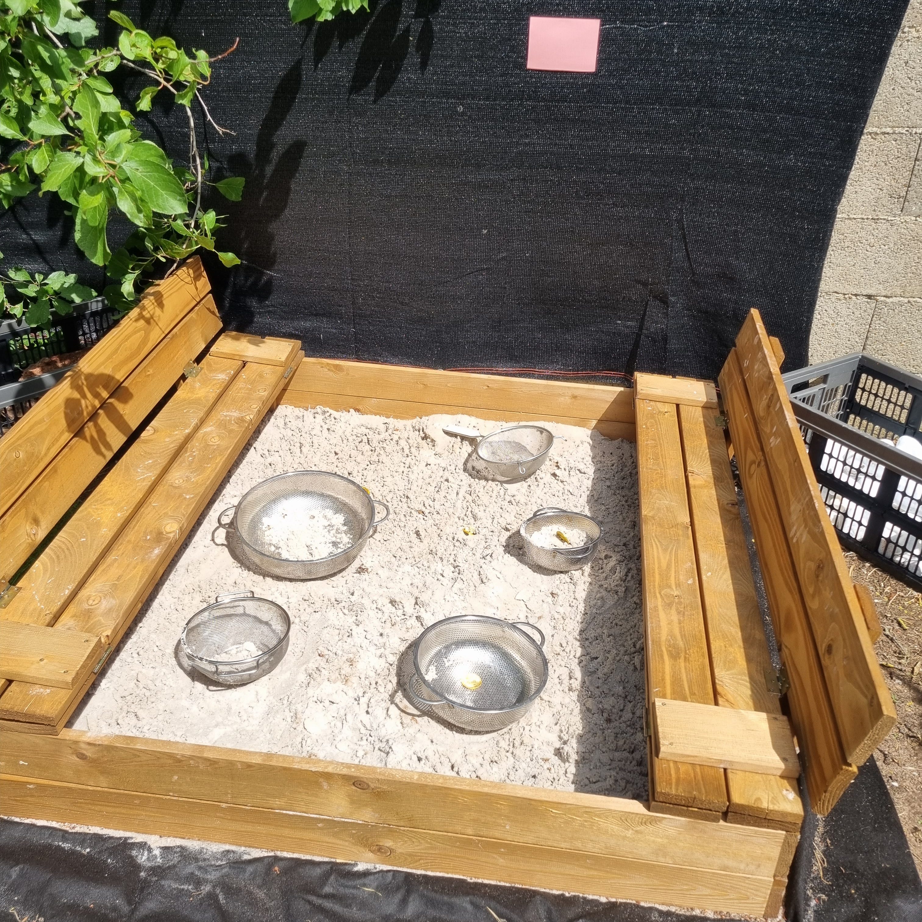 J’ai caché 10 pièces d’or dans le bac à sable. Les enfants devaient les retrouver à l’aide de passoires.
