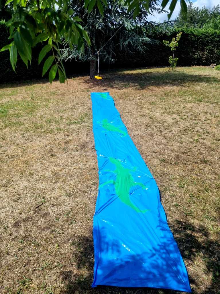 J’ai peint sur un rouleau de sacs poubelles bleus des crocodiles. J’ai fixé les sacs au sol avec des crochets en fil de fer (pour les boules de sapin). Les enfants devaient traverser ce « fleuve » avec la tyrolienne, sans tomber.