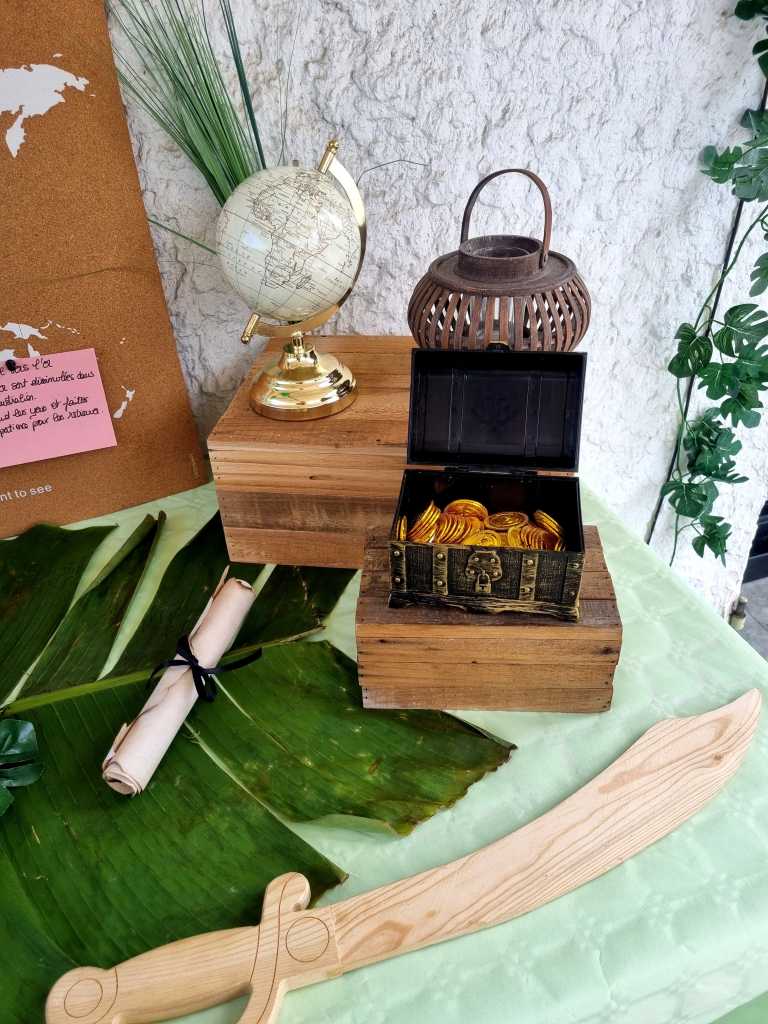 J’ai ajouté quelques accessoires : une lettre de mission sur un papier parchemin, un petit globe (Action), une lanterne (offerte), un petit coffre avec des pièces d’or (Amazon) et une boussole (j’aurai préféré une avec un style vintage mais je ne voulais pas faire trop de dépenses, j’ai donc utilisé la nôtre).