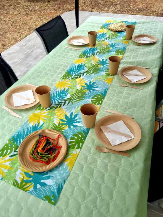 Pour la table de goûter, j’ai utilisé la même nappe verte que pour le buffet, un chemin de table (des 4 ans de Taïs, il venait d’Action il me semble), des assiettes et verres en kraft et des couverts en bambou (Action).