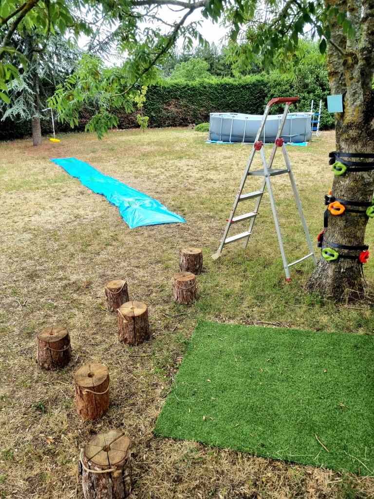 Avant de monter sur la tyrolienne, les enfants avaient un petit parcours en rondins pour accéder à l’escabeau.