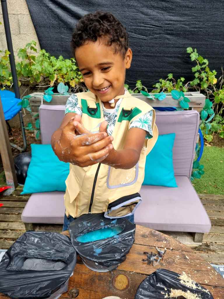 Les seaux contenaient : du sable élastique, du slime, de la laine, de la sciure et de la paille. J’avais également mis quelques insectes en plastique.