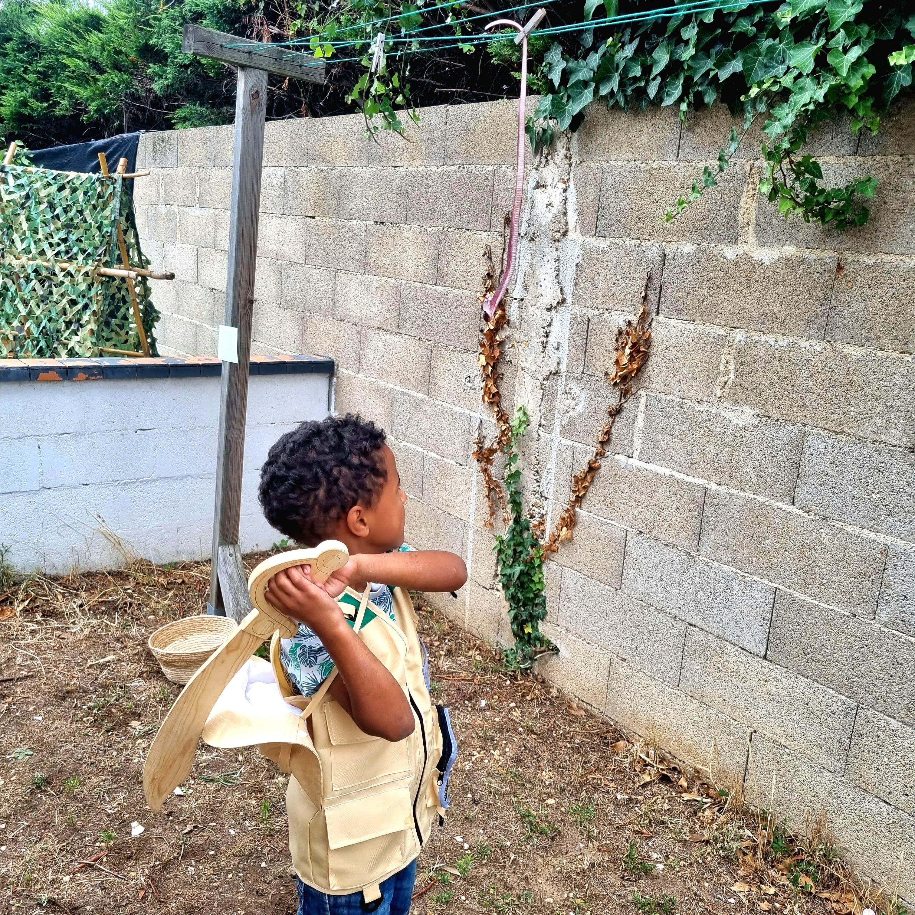 J’aurai aimé un chapeau d’Indiana Jones mais je n’en ai pas trouvé. J’ai donc pris un déguisement d’explorateur avec un chapeau et une petite veste (Amazon), qui finalement allaient plutôt bien à Taïs.