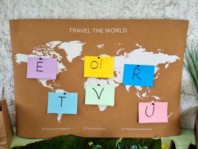 Les défis étaient inscrits sur des feuilles de couleurs accrochées sur la carte du monde. Les feuilles avec les lettres étaient fixées, avec de la patafix, près du jeu en question. Une fois le défi relevé, les enfants venaient accrochés la lettre sur le tableau.