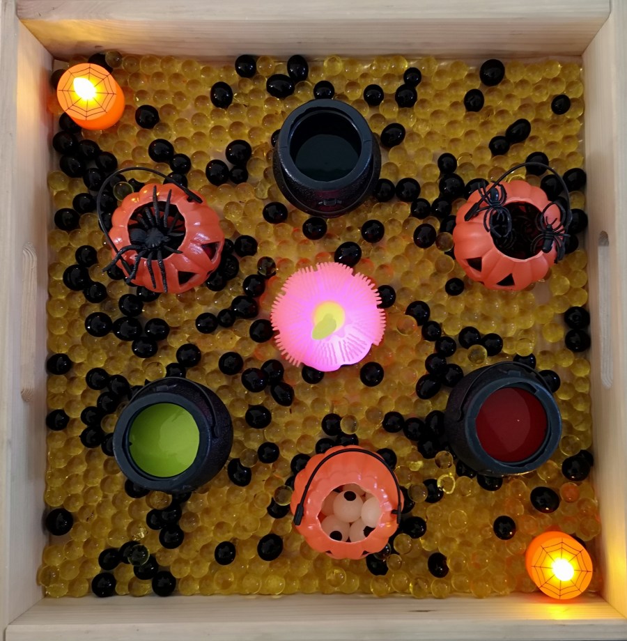 Nouveau bac sensoriel d'Halloween, cette fois-ci noir et blanc. Il s'agit d'un bac qui fait découvrir différentes textures (grains de riz, yeux gluants, araignées en caoutchouc, toile d'araignée en fibre textile, stickers en mousse...) et de nouvelles imageries d'Halloween (momie, fantôme, chat noir, chauve-souris...). Un bac qui invite également à la manipulation et au transvasement. …